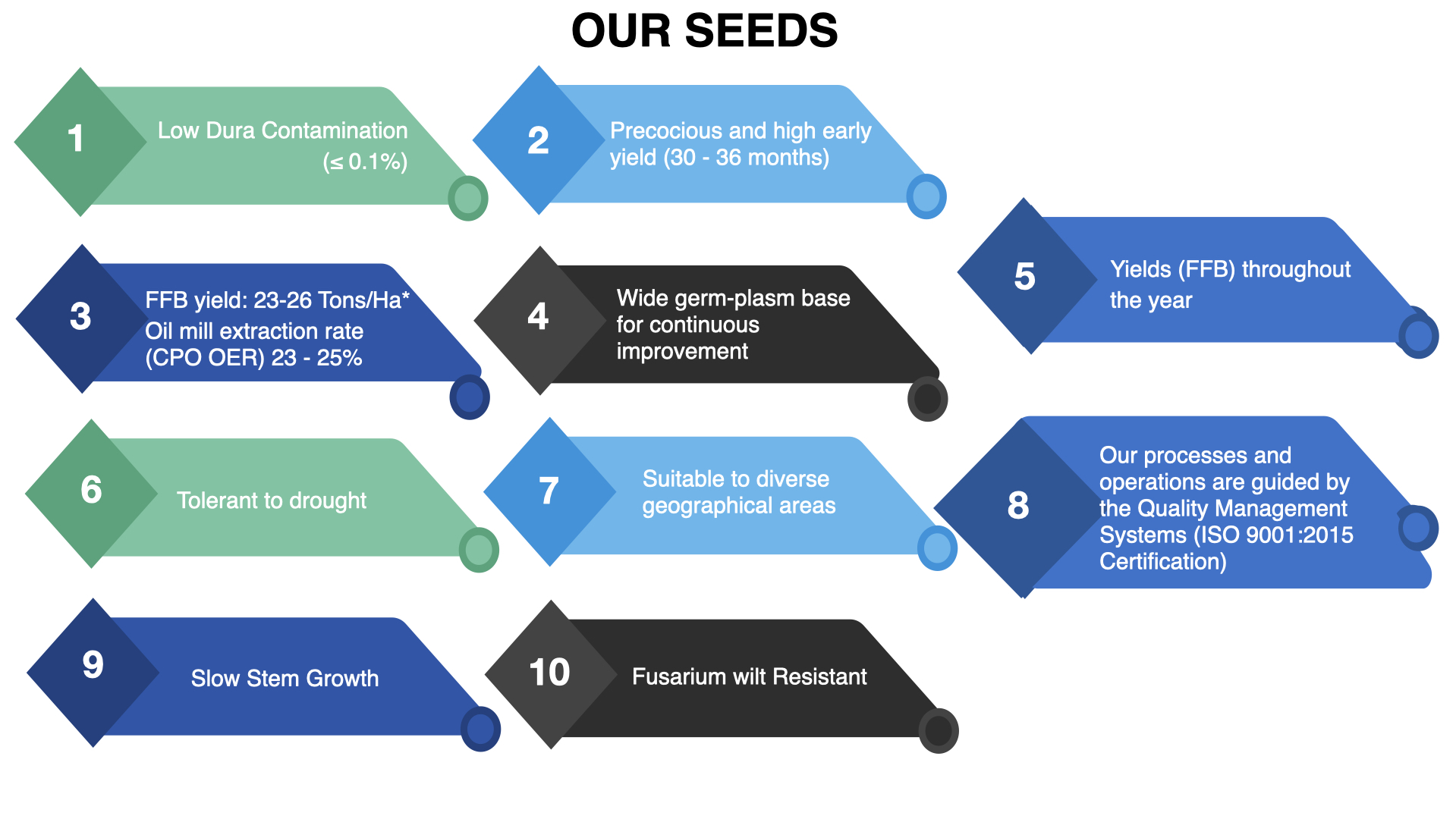 We believe that our pollinators, as tested by our blank pollinations, give almost pure DxP "Tenera" seed. We guarantee the purity standard that our seed will give less than 1 in 1,000 Dura type palms on a field planting, a 99.9% purity.